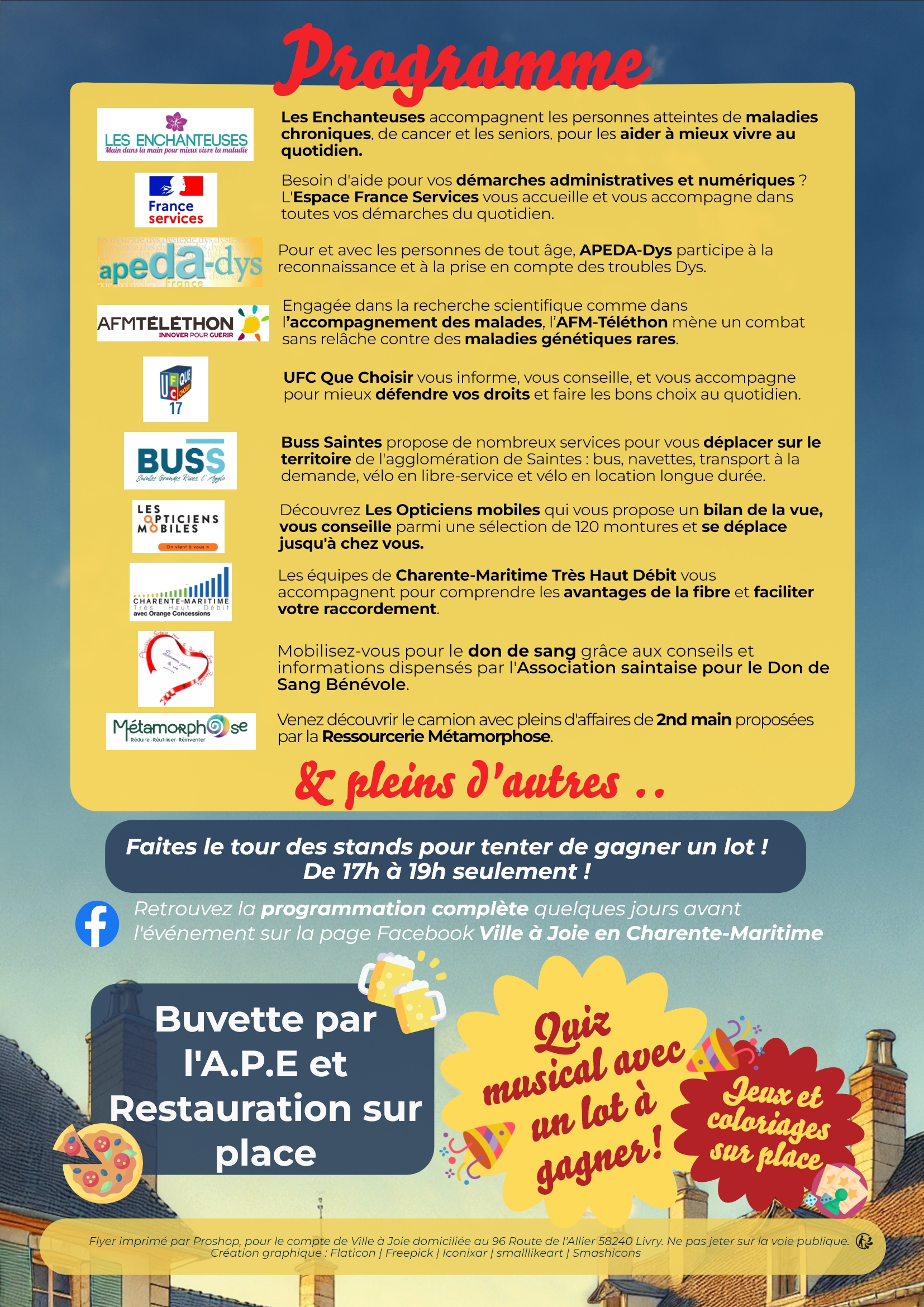 En 2025 Ville à joie était présente à Migron et Courcoury. Née en Bourgogne, cette entreprise solidaire d’utilité sociale propose des rendez-vous festifs, conviviaux et gratuits dans des petites communes. L’objectif est de revitaliser les territoires ruraux en faisant connaître les associations locales, les artisans et les producteurs du territoire, en les informant des différents services du quotidien : présence d’un stand de l’UFC-Que Choisir avec son du lien social.